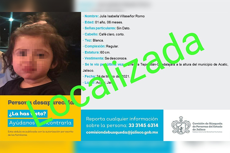 Julia Isabella Villaseñor Romo, 1 año 6 meses, fue localizada con vida en el municipio de La Barca, entidad que está a 100 kilómetros del sitio en que la menor fue desaparecida de manera forzada junto con Iker Fabricio Escoto Villaseñor, 9 años; Jimena Romo Jiménez, 24 años; y sus padres, Virginia Guadalupe Villaseñor Cabrera, 24 años, y Julio Alberto Villaseñor Cabrera, 34 años, el pasado 24 de marzo del 2021 en Acatic, Jalisco.