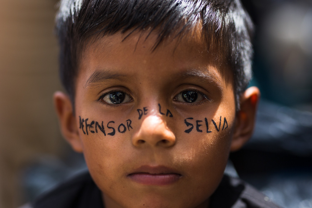 “Defensor de la selva”, escrito con tintura de pitu en la cara de un niño, hijo de las mujeres amazónicas. Foto: Darwin Pizarro-Fluxus Foto.