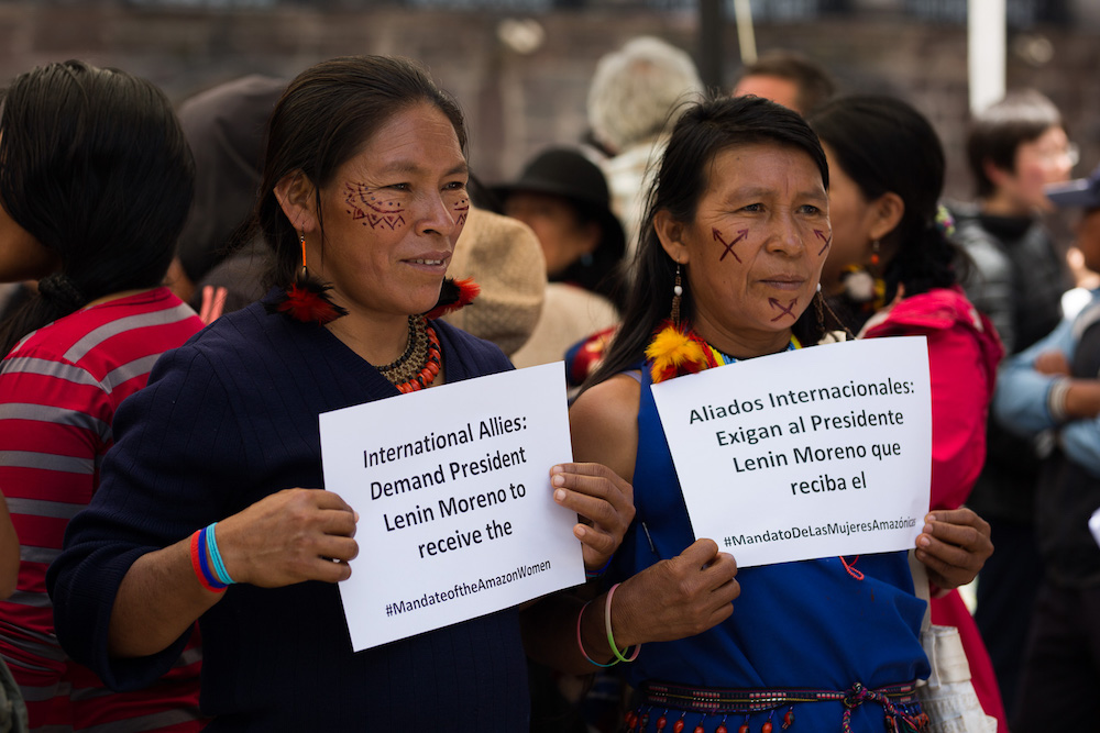El quinto día de protesta, las mujeres amazónicas pudieron reunirse con el secretario particular del presidente Lenín Moreno, Juan Sebastián Roldán. Fue una reunión a puerta cerrada. Su mandato contiene 22 puntos y exigen su cumplimiento. Se trata de derechos y no de quejas. Entre las demandas se encuentran la suspensión de licitación de nuevas rondas petroleras, la conformación de una comisión de la verdad para que haga justicia en el caso de asesinatos de líderes indígenas, así como la reparación a las familias. Se destaca la solicitud de “investigación profunda e histórica sobre la violencia sexual y de género asociada a las actividades mineras, petroleras y militarización para que se apliquen sanciones necesarias y se brinden garantías para la NO repetición en territorios indígenas amazónicos.”