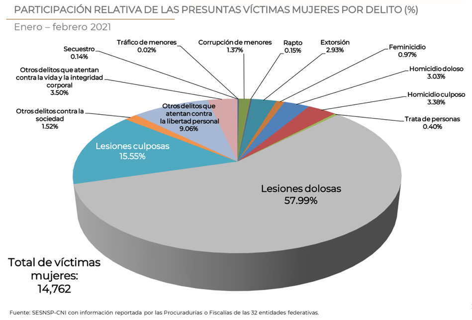 En cuanto a los delitos donde las víctimas son mujeres, el reporte Información sobre violencia contra las mujeres y el de Incidencia delictiva y llamadas de emergencia 9-1-1, indican que el 57.99% de los delitos que denuncian las mujeres son lesiones dolosas y el 15.55% son lesiones culposas.