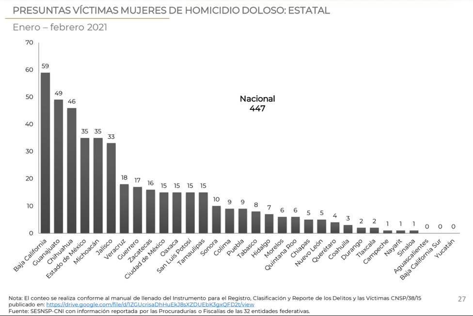 De acuerdo al reporte de Información sobre violencia contra las mujeres y al de Incidencia delictiva y llamadas de emergencia 9-1-1 realizados por el Secretario Ejecutivo del Sistema Nacional de Seguridad Pública (SESNP), en los dos primeros meses del año, en México se han cometido 142 feminicidios, 447 homicidios dolosos y 499 homicidios culposos en contra de mujeres.