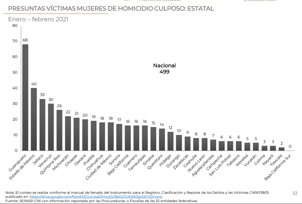En cuanto a las víctimas de homicidio culposos, en la misma temporalidad, a 499 les fue arrebatada la vida; los estados con más homicidios culposos son: Guanajuato (con 68); Estado de México (40) y Jalisco (33).