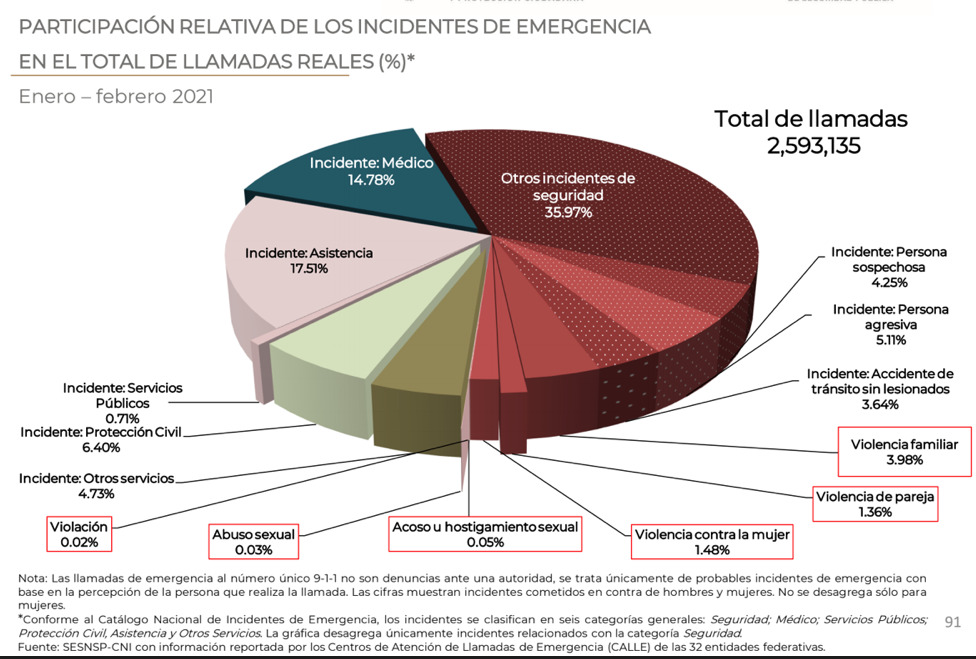 Finalmente, en las llamadas de emergencias reales recibidas en el 911, en los dos primeros meses del año se registraron 2 millones 593 mil 135 llamadas; el 36% fueron para denunciar diversos incidentes de seguridad; 17.51% para solicitar asistencia y el 14.78% para información médica; sin embargo, del total de llamadas: 3.98% fue para denunciar violencia familiar; 1.36% violencia de pareja; 1.48% violencia contra la mujer y el 0.05% acoso u hostigamiento sexual.