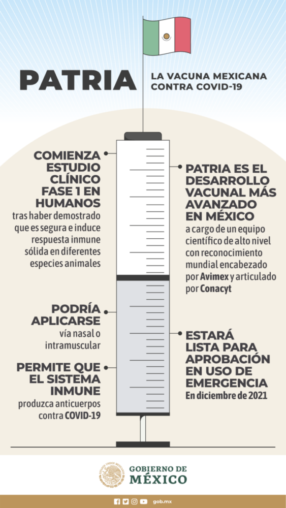 “En cuanto se administre al primer voluntario nos vamos a posicionar como país dentro de los primeros siete u ocho países que tienen ya la capacidad de diseñar sus vacunas, de producirlas y probarlas a pequeña escala en ensayos preclínicos y llevarlas a ensayos clínicos”, dijo. “Si todo sale bien, pues México volverá a posicionarse como potencia mundial para la producción de vacunas”.