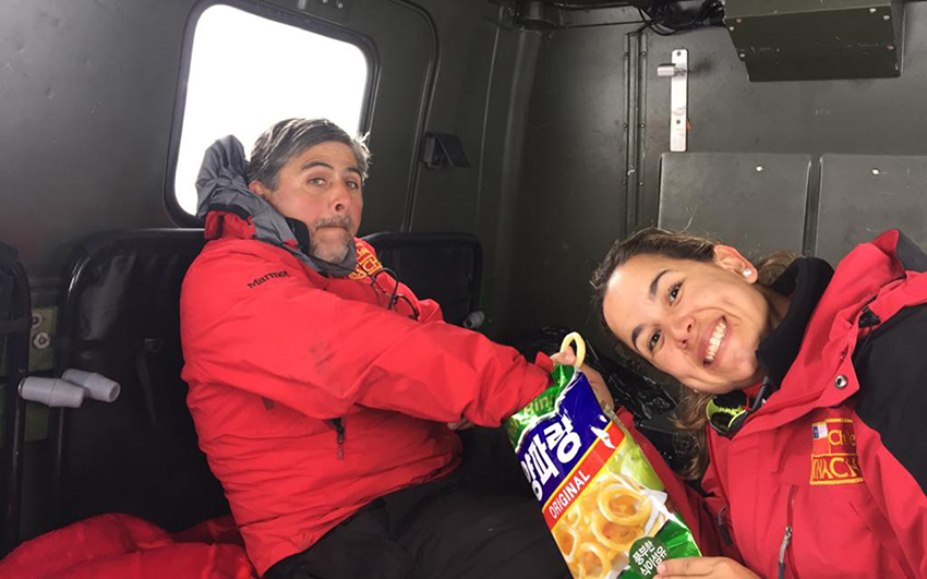 Juliana Vianna y Daniel González Acuña al interior de un tractor nieve camino a una colonia de pingüinos en Antártica. Foto: Juliana Vianna