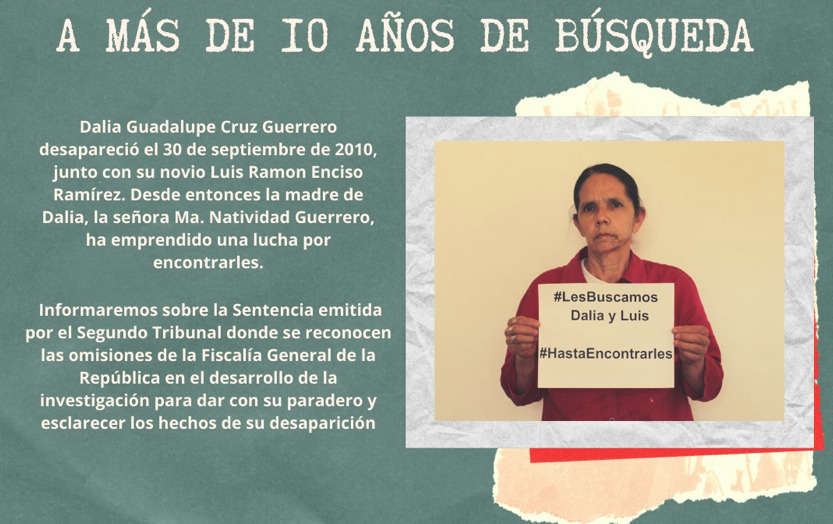 Comunicado de CEPAD sobre la sentencia inédita se reconocen las omisiones de la FGR en la investigación y búsqueda de Dalia Cruz y Luis Enciso, desaparecidos desde el 30 de septiembre de 2010.
