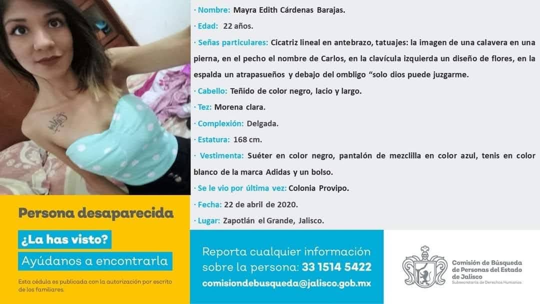 Mayra Edith Cárdenas Barajas fue vista por última vez en la colonia PROVIPO de Ciudad Guzmán; Zapotlán El Grande, el 22 de abril de 2020. A un año de su desaparición, su madre y el Colectivo de Familiares Desaparecidos de Ciudad Guzmán, convocaron a una acción pacífica con la intención de exigir justicia y apoyo de las autoridades para su localización.