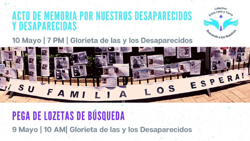 El 10 de mayo a las 19 horas, el Colectivo Entre Cielo y Tierra en la “Glorieta de las y los desaparecidos de Jalisco” harán un acto de memoria y exigencia de búsqueda.
