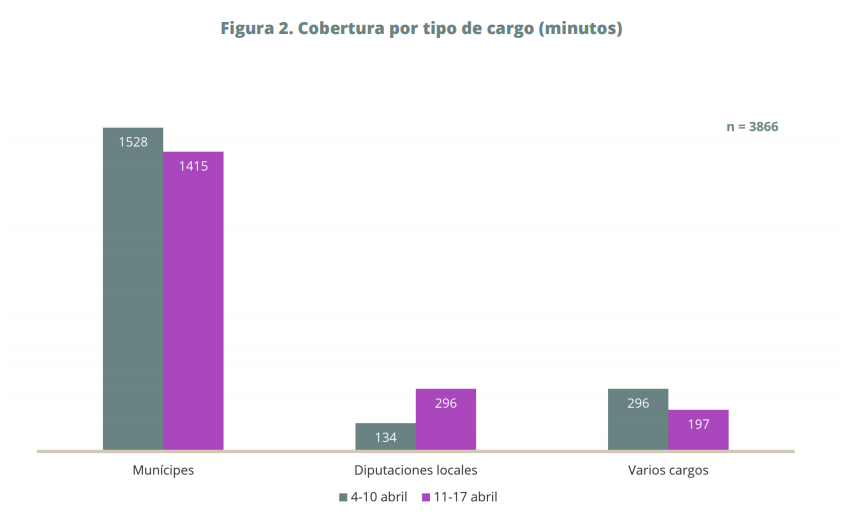 En este periodo, las fuerzas políticas con mayor presencia en la cobertura de las candidaturas municipales (2943 minutos) fueron el partido MORENA (21 %); Movimiento Ciudadano (20 %) y Futuro (10 %).