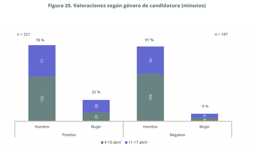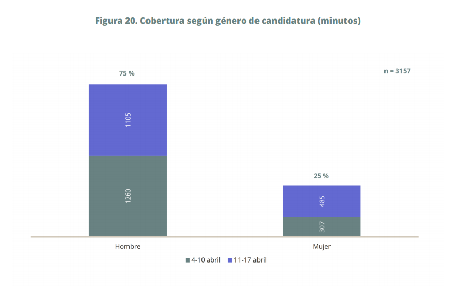 La cobertura en el porcentaje de minutos al aire en radio y televisión por género privilegió a los hombres candidatos con el 75% del tiempo, mientras que, para las mujeres fue de 25 %. Es decir, solo aumentó un 10% en comparación al proceso electoral en el 2018.