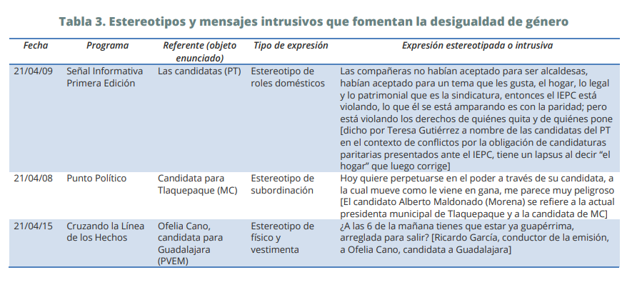 De la misma forma, persistió la presencia de estereotipos y mensajes intrusivos que fomentan la desigualdad de género; estereotipos de roles domésticos, de subordinación o relacionados con su vestimenta y/o físico fueron algunas de las expresiones que marcaron la cobertura realizada por los medios a las mujeres candidatas.