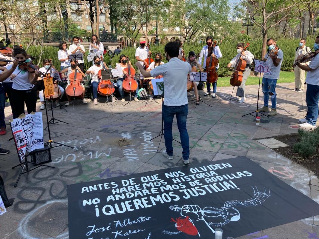 En la protesta pacífica participaron integrantes de la orquesta de cámara de la Universidad Autónoma de Guadalajara (UAG) a la que José Alberto, “Teto”, pertenecía, así como demás músicos y músicas solidarias que se sumaron a la demanda de justicia y alto a la violencia.