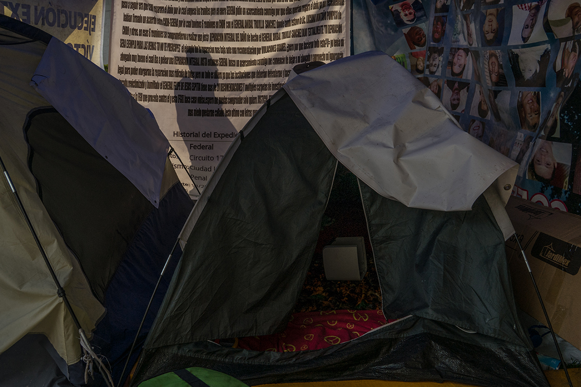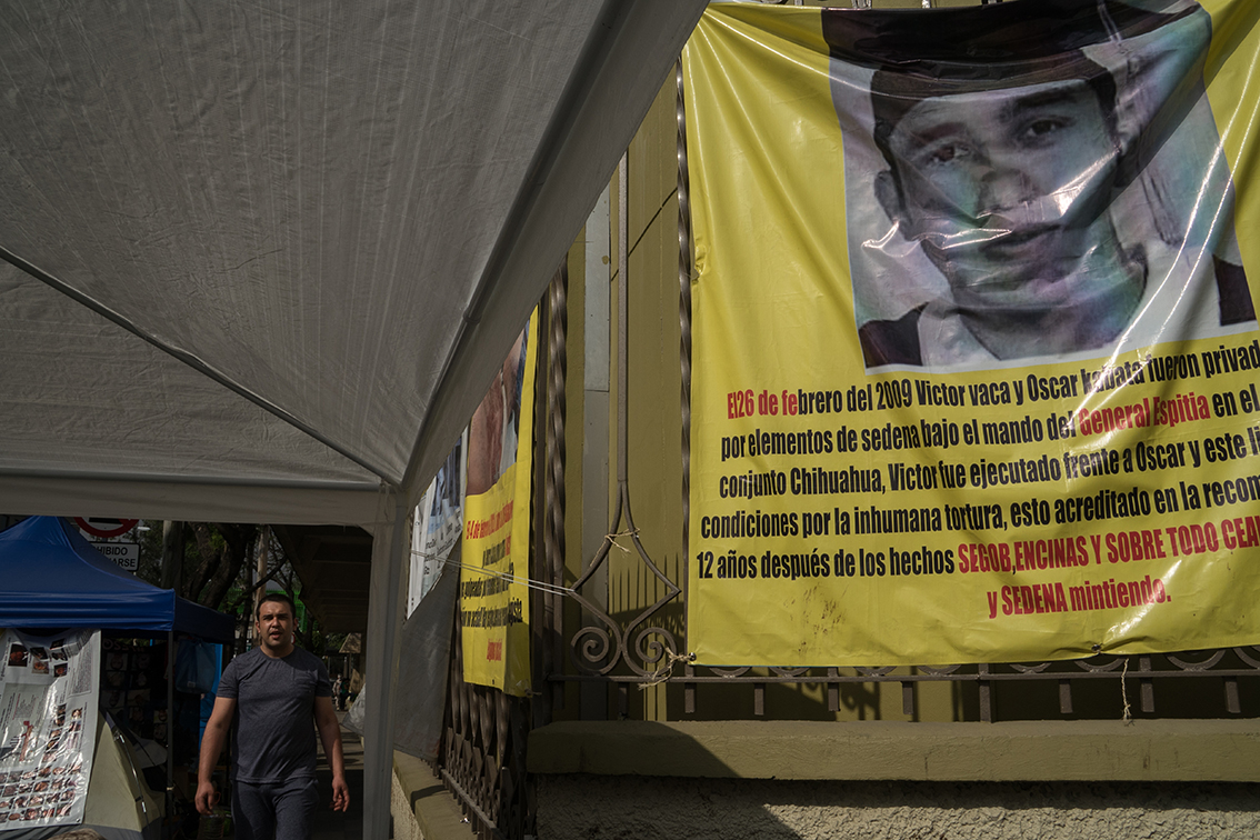 Óscar y su mamá, acompañados de Erick Dischard (cuyo papá y tío fueron ejecutados por el Ejército), protestan desde hace 49 días afuera de la Sedena. Exigen reparación del daño y castigo a los culpables.