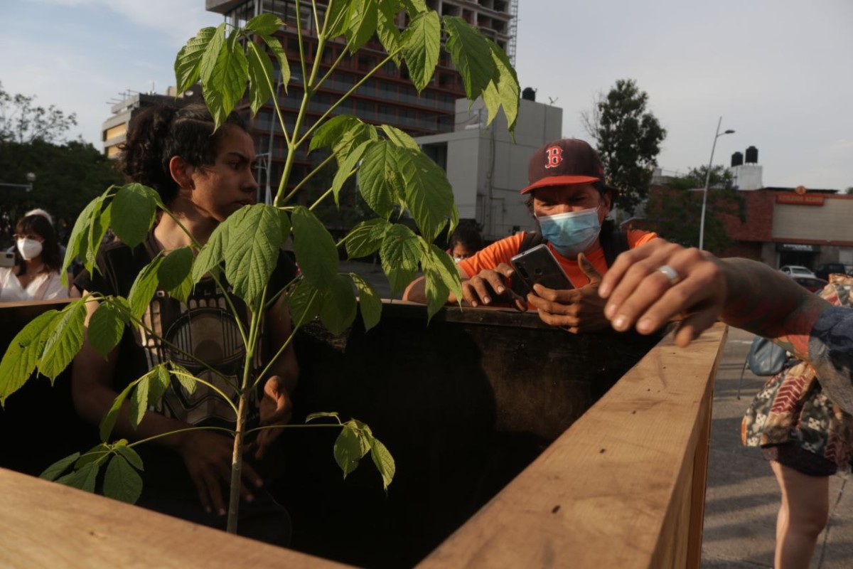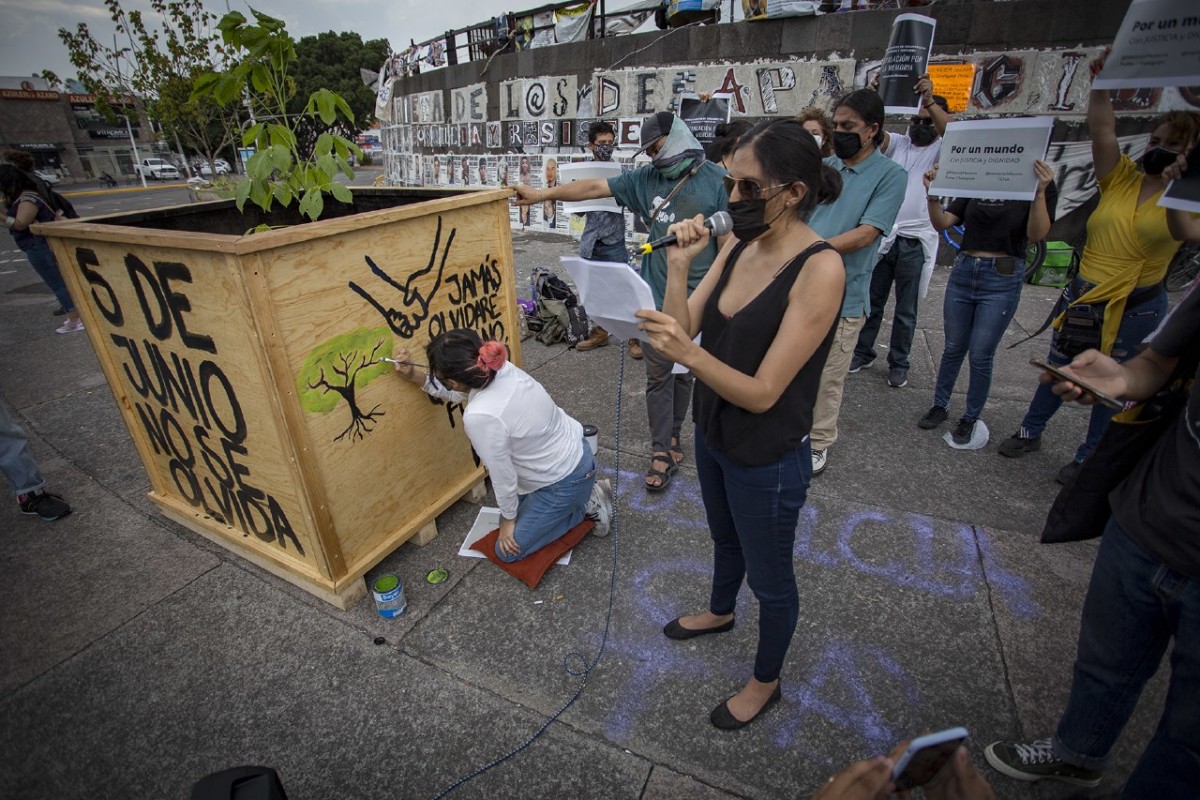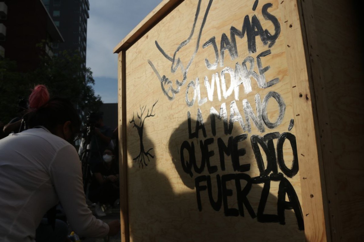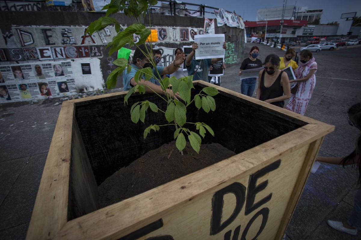 Una gran jardinera de madera en la que colocaron un árbol primavera al centro, es el símbolo del mensaje más potente de su exigencia de justicia, reparación y no repetición a un año: “donde han querido sembrar muerte, nosotras y nosotros sembramos vida”.