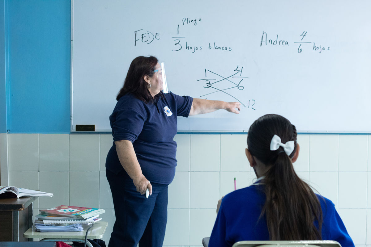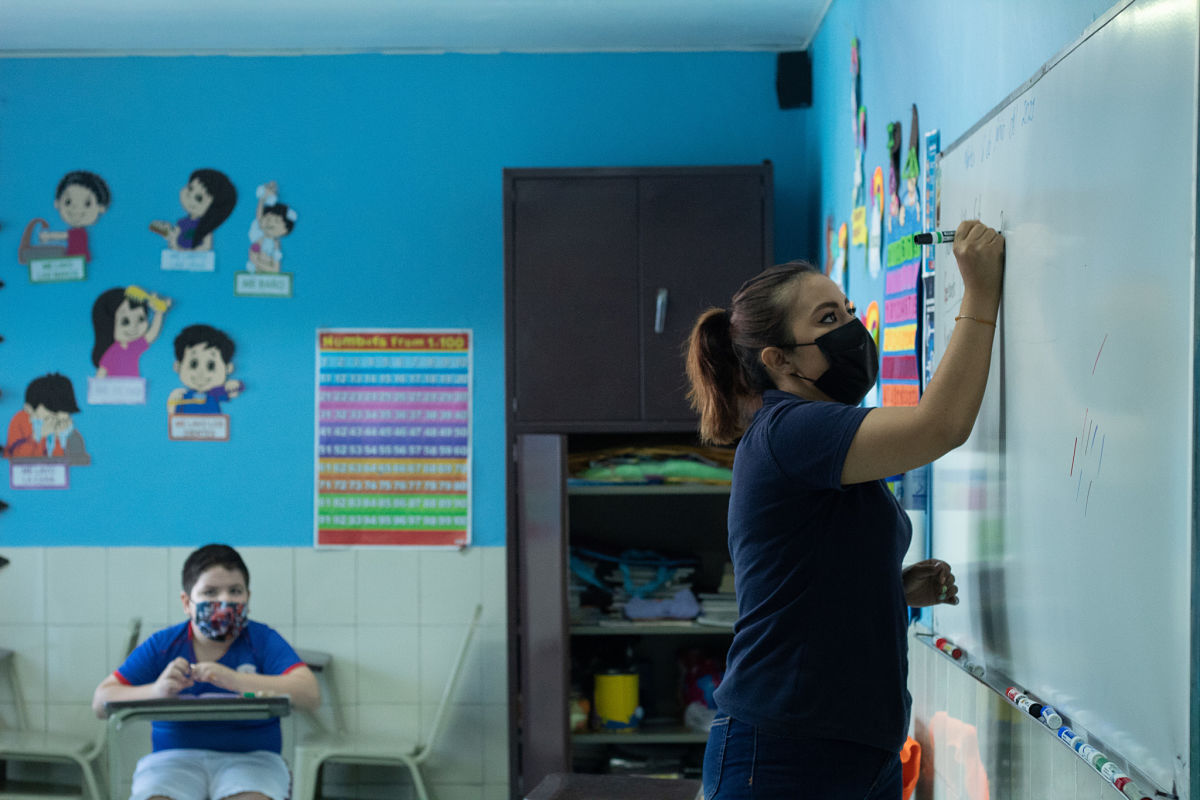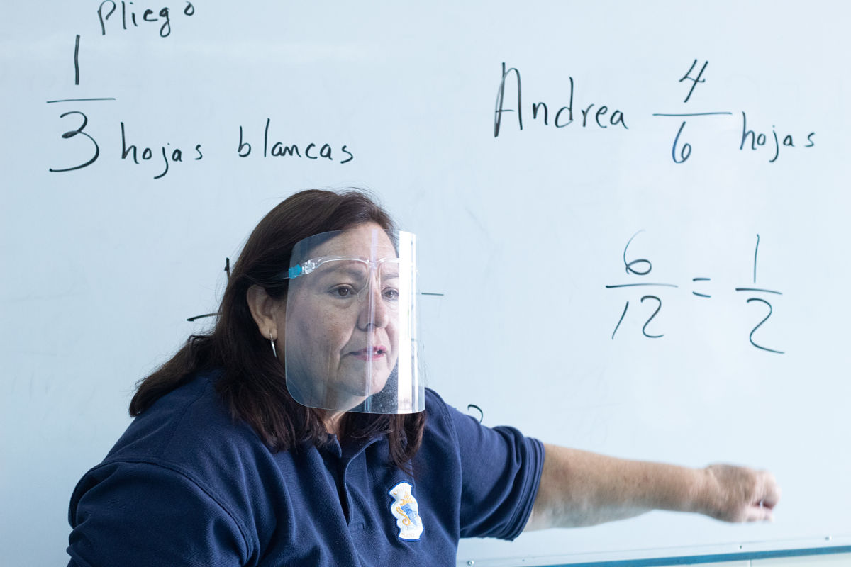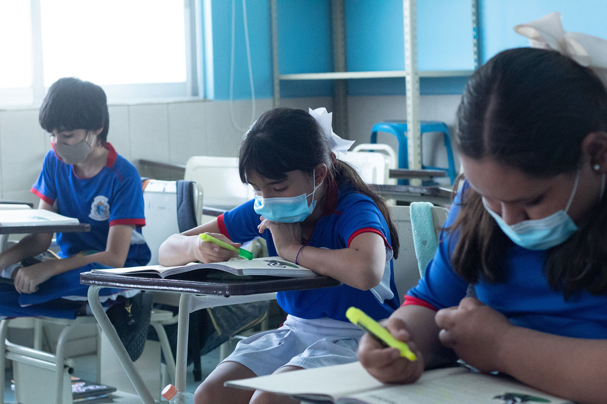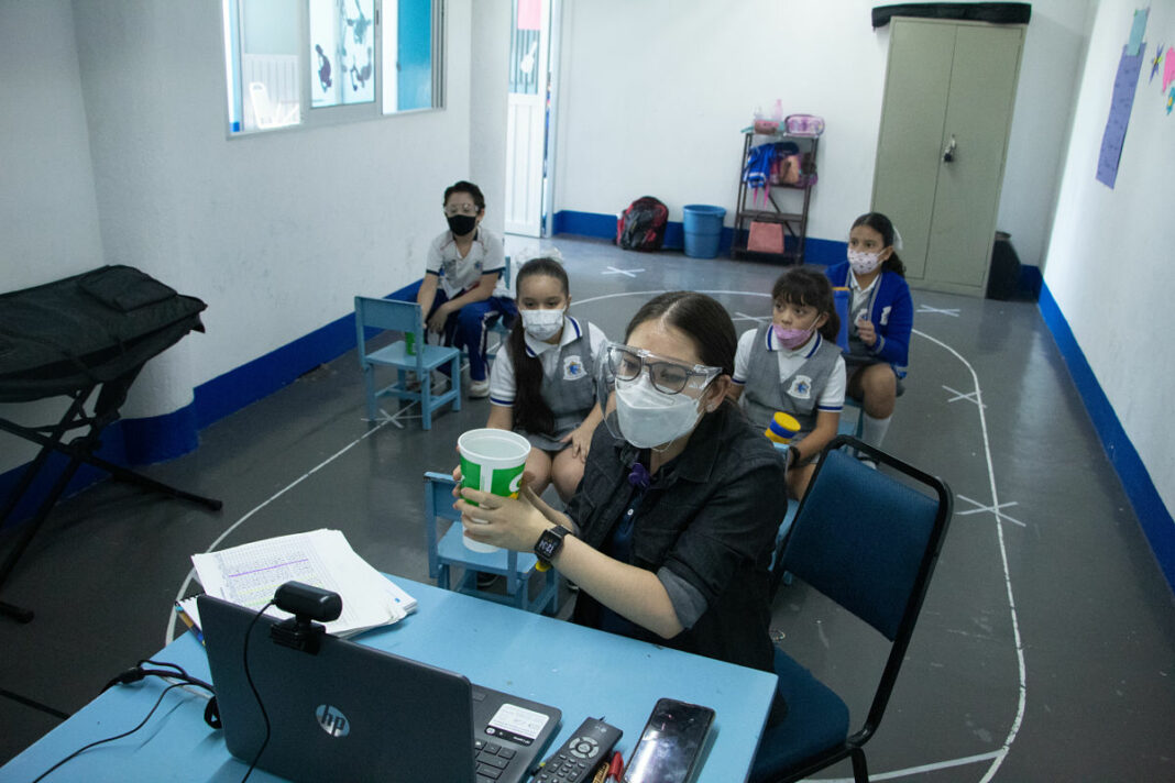 Estudiantes de quinto grado de primaria toman clases separados de sus compañeros y compañeras, cada uno portando su cubreboca.