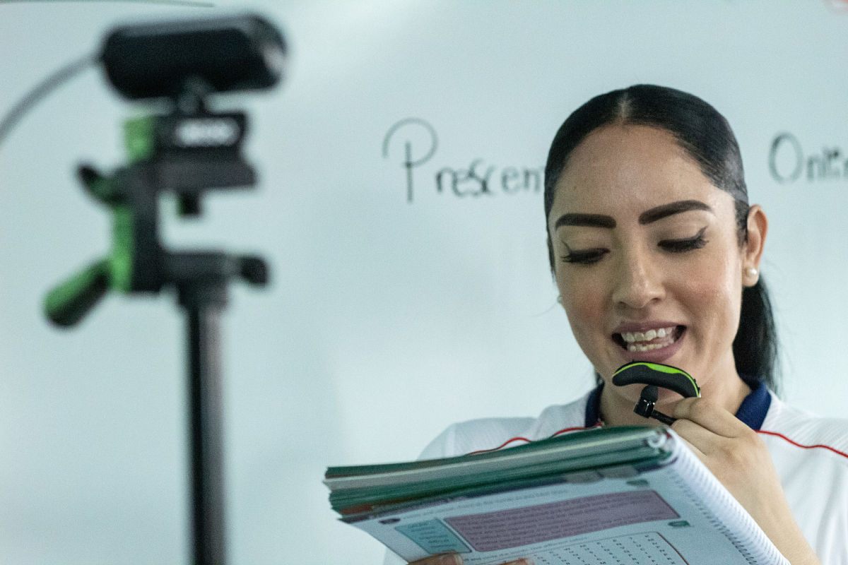 Kira, maestra de música da clases presenciales en el aula y al resto del grupo en línea