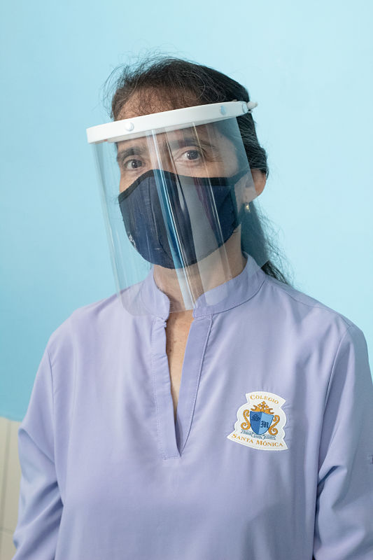 Lorena Carrillo, maestra de preescolar portando un cubre bocas y una careta facial protectora para impartir clases presenciales.