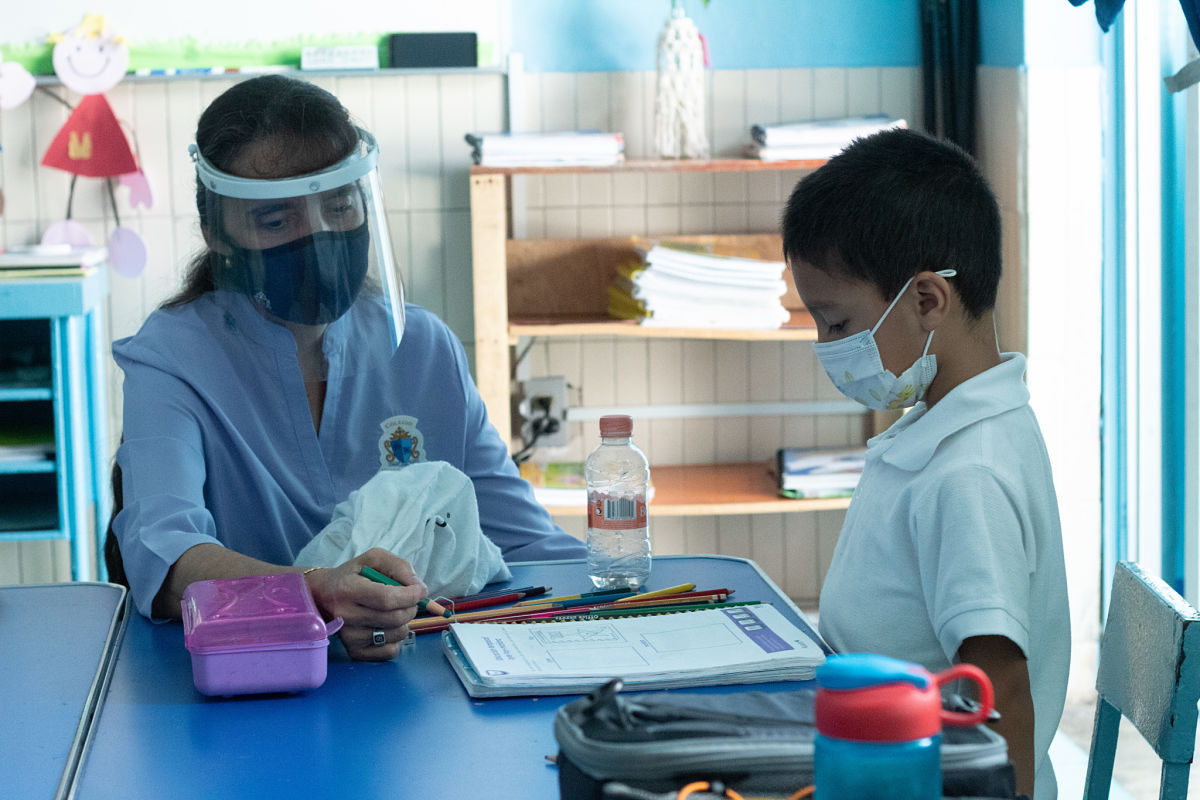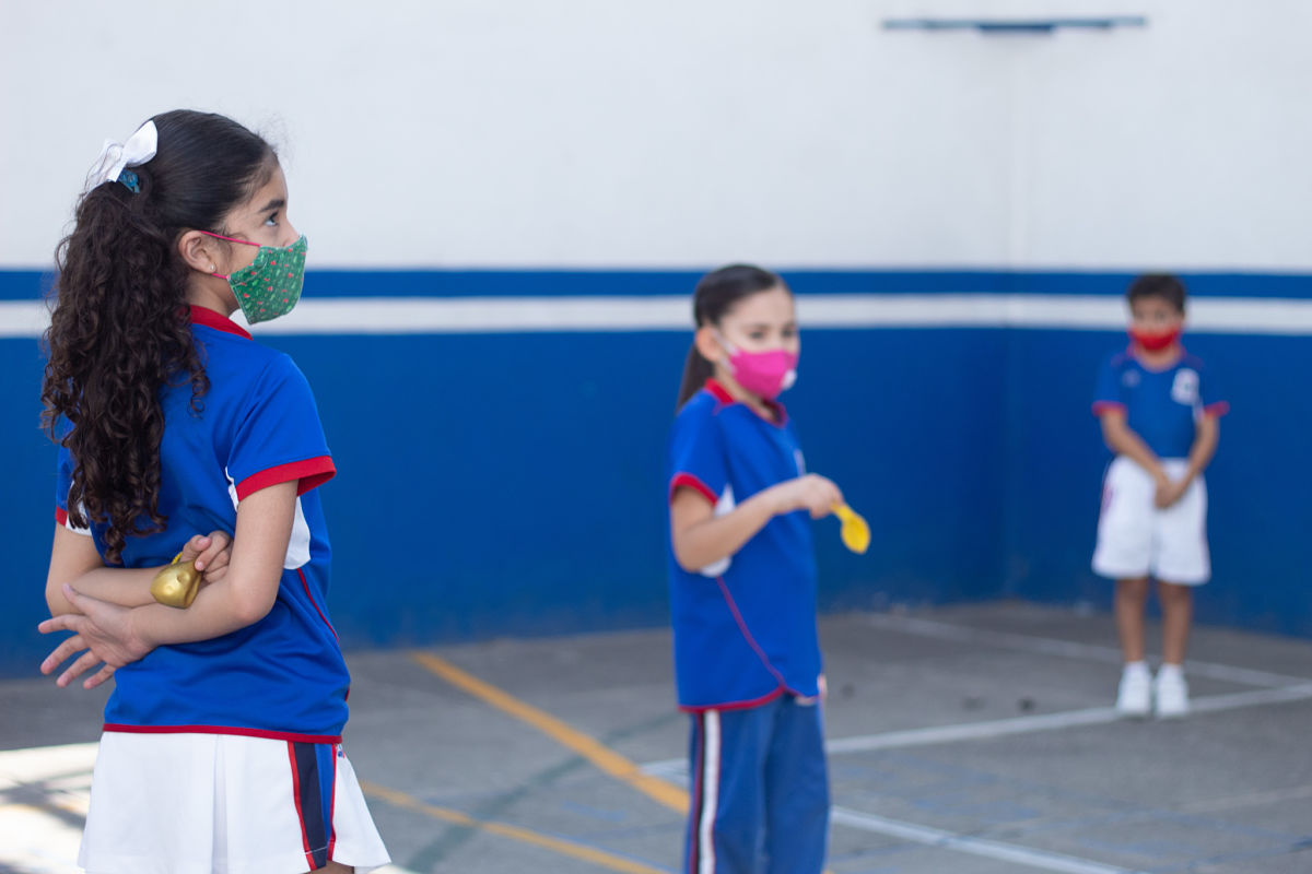 Para respetar la distancia entre el alumnado, las y los adoscentes, así como el personal del colegio, las clases de música, inglés, matemáticas, español y educación físca son impartidas para grupos reducidos, pues no pueden asistir más de 9 niños y niñas por cada aula.