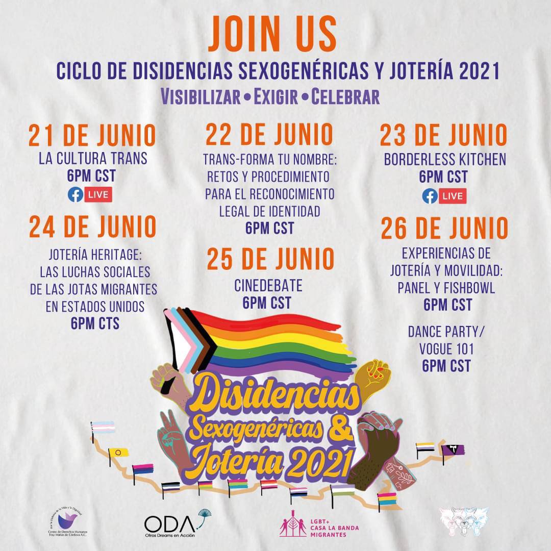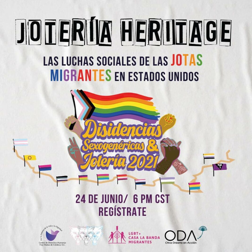 Con el objetivo de “visibilizar, exigir y celebrar” las diversas luchas y existencias de la comunidad migrante LGBTTTIQAP*, la organización Otros Dreams en Acción (ODA) invita a la ciudadanía a ser parte de la primera edición del “Ciclo Disidencias Sexogenéricas y Jotería 2021”.