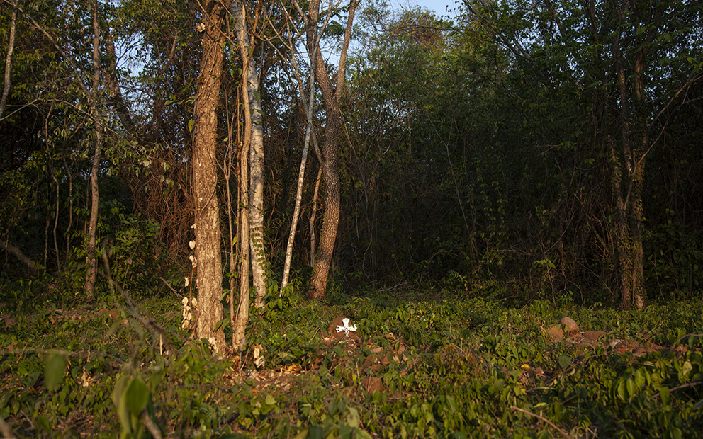 Gran parte del cementerio fue arrasada por el avance del proyecto de monocultivo de eucalipto. El pueblo Qom acostumbra a enterrar a sus muertos en el bosque. Este sector del cementerio, próximo al territorio en disputa logró salvarse de la extinción luego del desmonte realizado en agosto de 2020. Foto: Mayeli Villalba.
