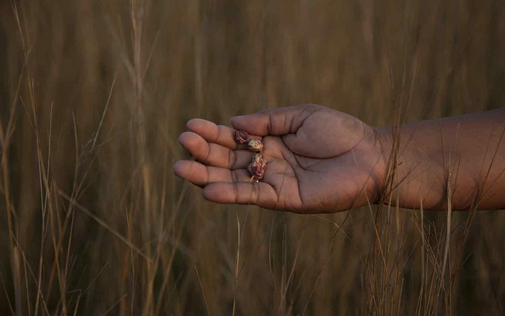 Bernarda Pesoa sostiene las semillas de un árbol de algarrobo que fue derribado en agosto de 2020 por Fundación Paraguaya, para iniciar el monocultivo de eucalipto en las tierras ancestrales del pueblo Qom. Foto: Mayeli Villalba
