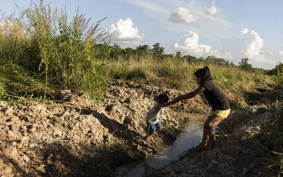Bernardita Coronel Pesoa (24) y Danilo Gonzáles Coronel (3), hija y nieto de Bernarda cruzan un canal de agua que Fundación Paraguaya construyó para direccionar los raudales de las lluvias, y evitar que así los agroquímicos del monocultivo llegue hasta las viviendas. Bernarda teme que el canal desemboque en las fuentes de agua de uso cotidiano de la comunidad. Foto: Mayeli Villalba