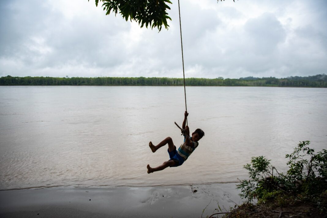 Tras cuatro horas en canoa aguas abajo en el río Napo llegamos a El Edén, una de 238 comunas y comunidades de la provincia de Orellana. Su extensión es de 864 Km2. Como su nombre anuncia, El Edén es un pequeño paraíso. Árboles de frutas tropicales, plantas y flores autóctonas caen. Y tan pronto pongo un pie en tierra kichwa, la aparición de un niño jugando entre las ramas de los árboles marca el inicio de este viaje. Cubierto de barro de pies a cabeza, solo sus ojos se iluminan. Paúl es un niño de ocho años que se divierte columpiándose con una cuerda en la rama de un árbol de mango. Con un salto desde el árbol, se zambulle en las aguas del río sin preocupación porque el «río es también espiritual». Las historias de los abuelos se refieren a Amazanga, espíritu de la selva, como a un niño juguetón.