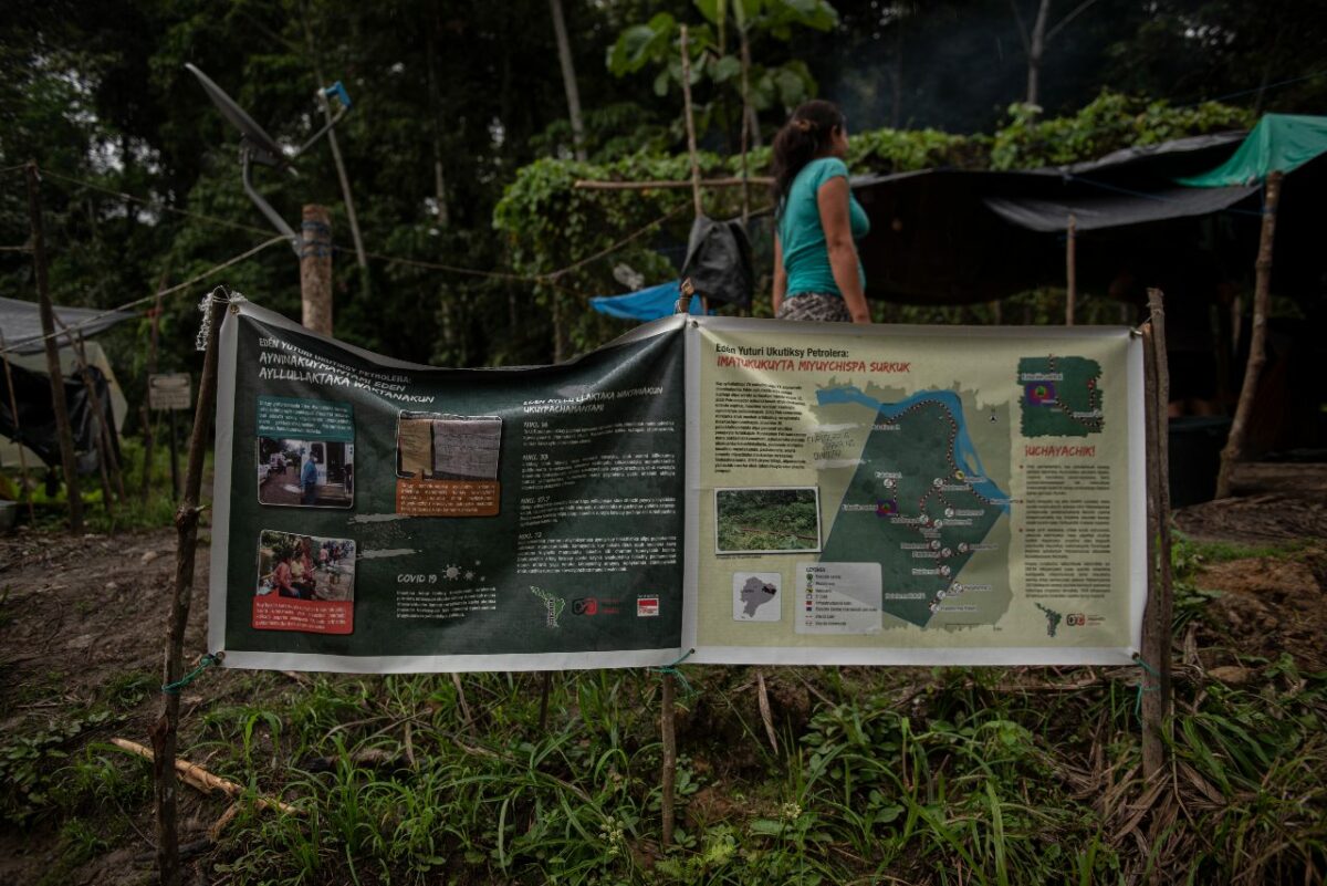 Una mujer camina junto a carteles ubicados alrededor del campamento con textos explicativos sobre las compensaciones que ha incumplido la empresa petrolera. Comunidad Kichwa El Edén – Ecuador, junio 2021. Foto: Josué Araujo