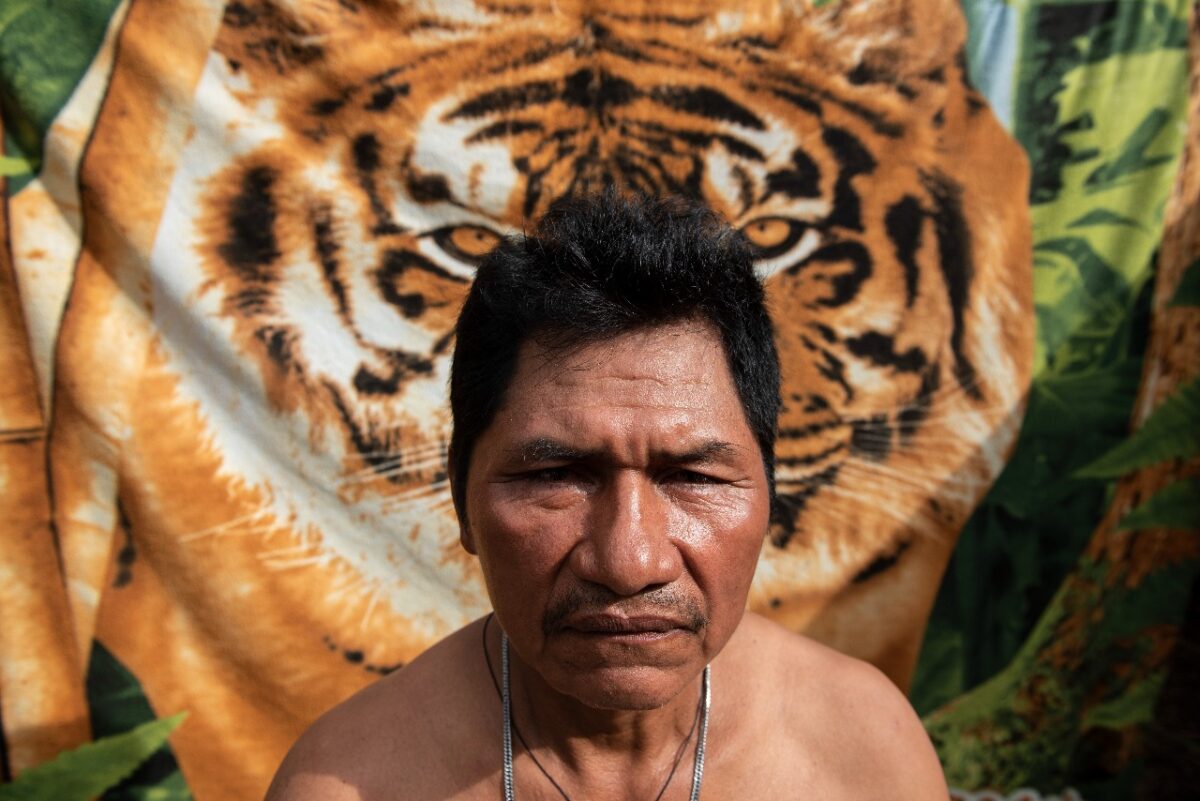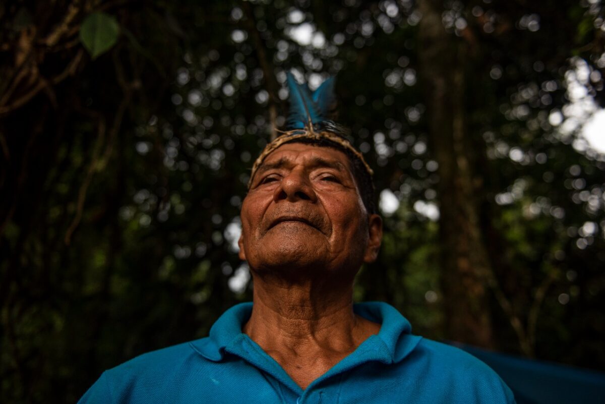 Retrato de Carlos Tapuy, líder histórico de la comuna El Edén. Su fuerza proviene de la resistencia milenaria del pueblo Kichwa Napureno. Es hijo del tigre-chamán, Domingo Tapuy, curandero que heredó el conocimiento de al menos 30 recetas de medicina ancestral. Comunidad Kichwa El Edén – Ecuador, junio 2021. Foto: Josué Araujo
