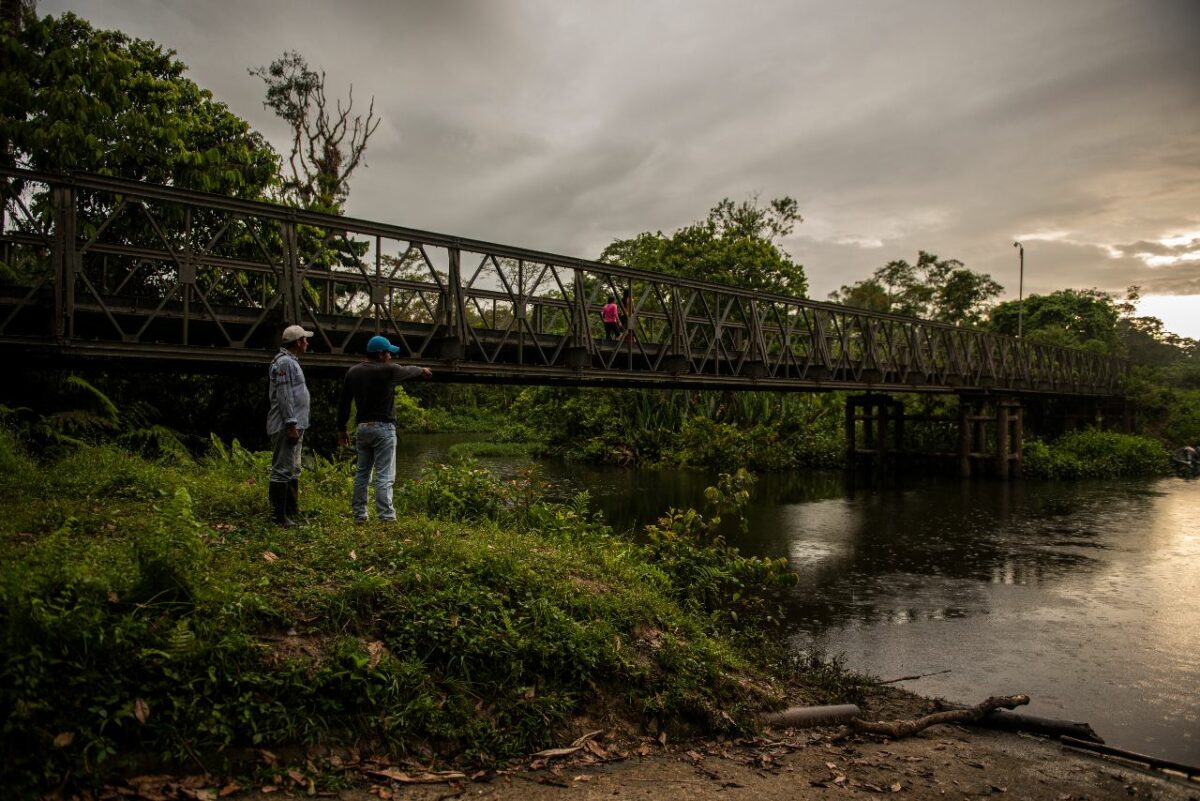 Carlos Tapuy y Wilson Quindigua junto al puente sobre el río Yuturi. Los comuneros aseguran que debajo del puente, una tubería presenta una constante fuga de aguas residuales provenientes de la empresa petrolera. Comunidad Kichwa El Edén – Ecuador, junio 2021. Foto: Josué Araujo