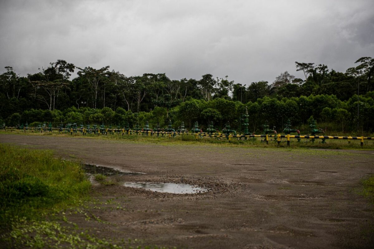 Más de 30 muñecos que marcan la perforación de pozos en la plataforma C, estación Edén Yuturi. A menos de tres kilómetros del poblado. Comunidad Kichwa El Edén – Ecuador, junio 2021. Foto: Josué Araujo