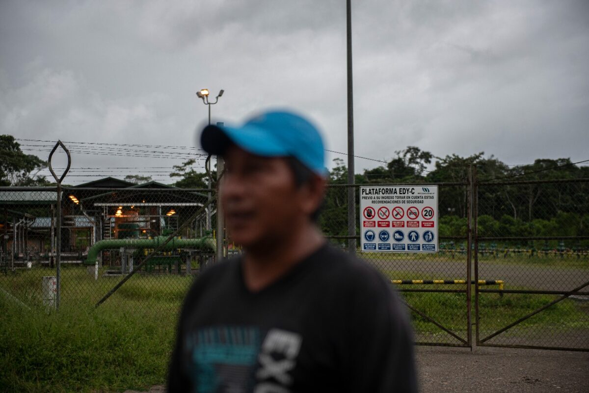 Wilson Quindigua, actual presidente de la comuna El Edén frente al ingreso de la plataforma C, estación Edén Yuturi, bajo la administración de Petroamazonas. Comunidad Kichwa El Edén – Ecuador, junio 2021. Foto: Josué Araujo