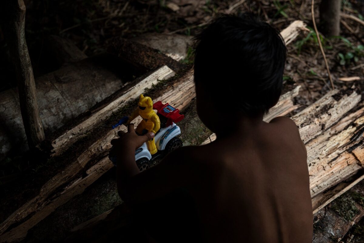 Un niño juega con su juguete dentro del campamento de resistencia junto a su familia. Comunidad Kichwa El Edén – Ecuador, junio 2021. Foto: Josué Araujo