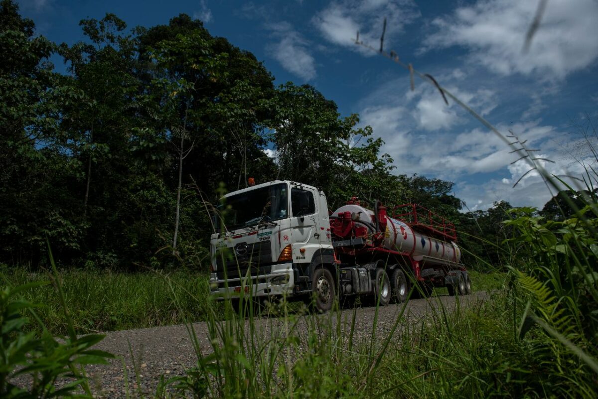 El tanquero de la empresa petrolera se encuentra retenido desde el día que iniciaron las movilizaciones. Comunidad Kichwa El Edén – Ecuador, junio 2021. Foto: Josué Araujo