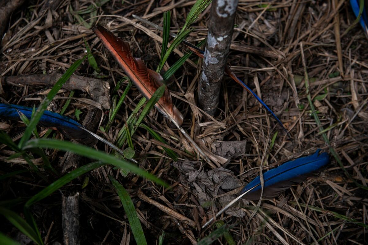 Detalle de las plumas multicolores de un guacamayo. Comunidad Kichwa El Edén – Ecuador, junio 2021. Foto: Josué Araujo