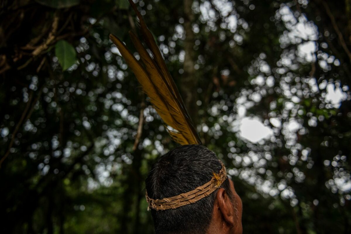 El cintillo que lleva Abelardo Vargas en su cabeza fue tejido por su esposa, Ermelinda, durante su estancia en el campamento. Está hecho con fibras vegetales y plumas de guacamayos. Comunidad Kichwa El Edén – Ecuador, junio 2021. Foto: Josué Araujo