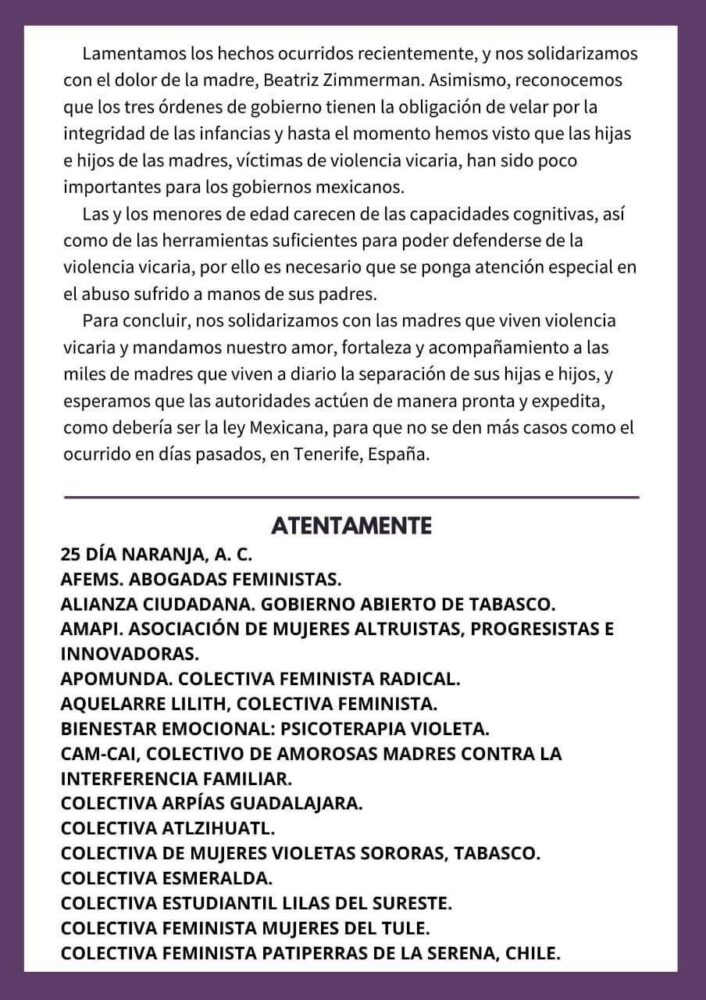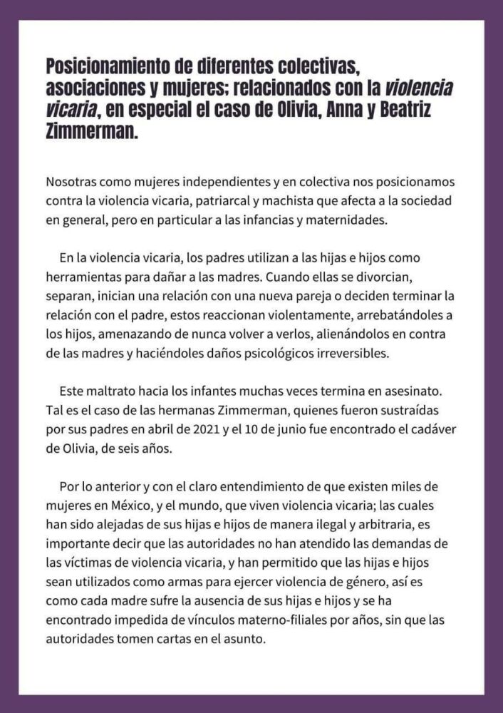 Tal es el caso de Olivia de 6 años quien fue encontrada muerta en las costas de Tenerife en España, después de que ella y su hermana fueran sustraídas por su padre. Ante estos eventos más de 150 mujeres de todo México, unieron fuerzas y lanzaron un pronunciamiento contra la violencia vicaria y machista en el país.