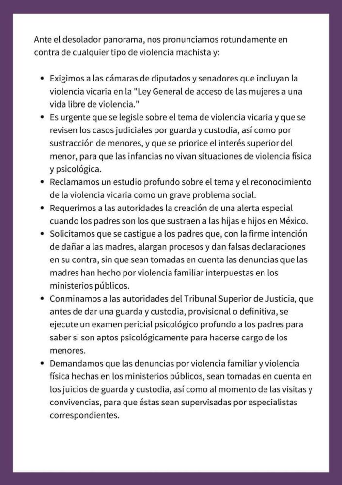 Con este documento exigen a las cámaras de diputados y senadores que incluyan la violencia vicaria en la “Ley General de Acceso de las Mujeres a una Vida Libre de Violencia”. Además, reclamaron un estudio profundo sobre el tema, así como el reconocimiento de este tipo de violencia como un grave problema social.