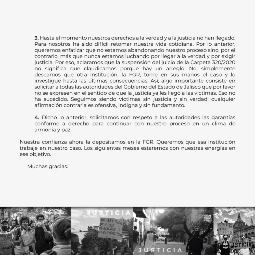 “No estamos abandonando nuestro proceso, sino por el contrario, más que nunca estamos luchando por llegar a la verdad y por exigir justicia. Por eso, aclaramos que la suspensión del juicio de la Carpeta 320/2020 no significa que claudicamos porque hay un arreglo. No, simplemente deseamos que otra institución, la FGR, tome en sus manos el caso y lo investigue hasta sus últimas consecuencias”.
