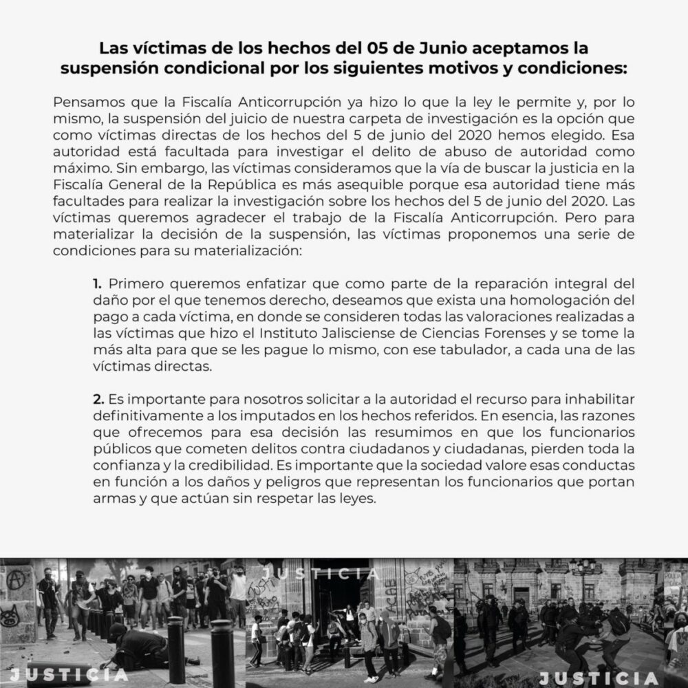 En su comunicado precisaron que así como la Ley establece la posibilidad de que los señalados puedan solicitar “la suspensión condicional del proceso”, ellos, como víctimas, también tienen derecho a “una reparación integral del daño”, la cual el Juez Octavo de Control, Javier García Muñoz, estimó en 278 mil pesos para las 16 víctimas y 15 más para resarcir los daños causados a la sociedad jalisciense. De ahí que que hayan aceptado este medida como parte del proceso.
