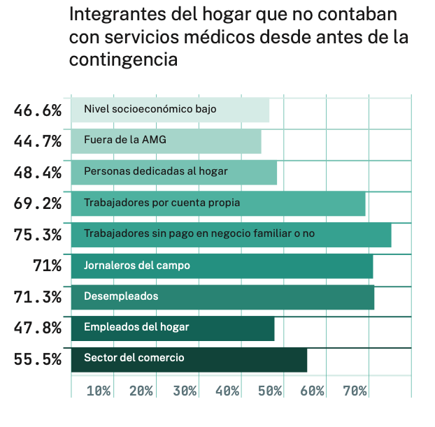 Aún cuando en México existe la Ley General de Salud y el Derecho a la Protección de Salud, el 37.4% de las personas encuestadas manifestó que “no contaba con servicio médico desde antes de la contingencia”, y un 3.7% perdió este derecho durante la pandemia.