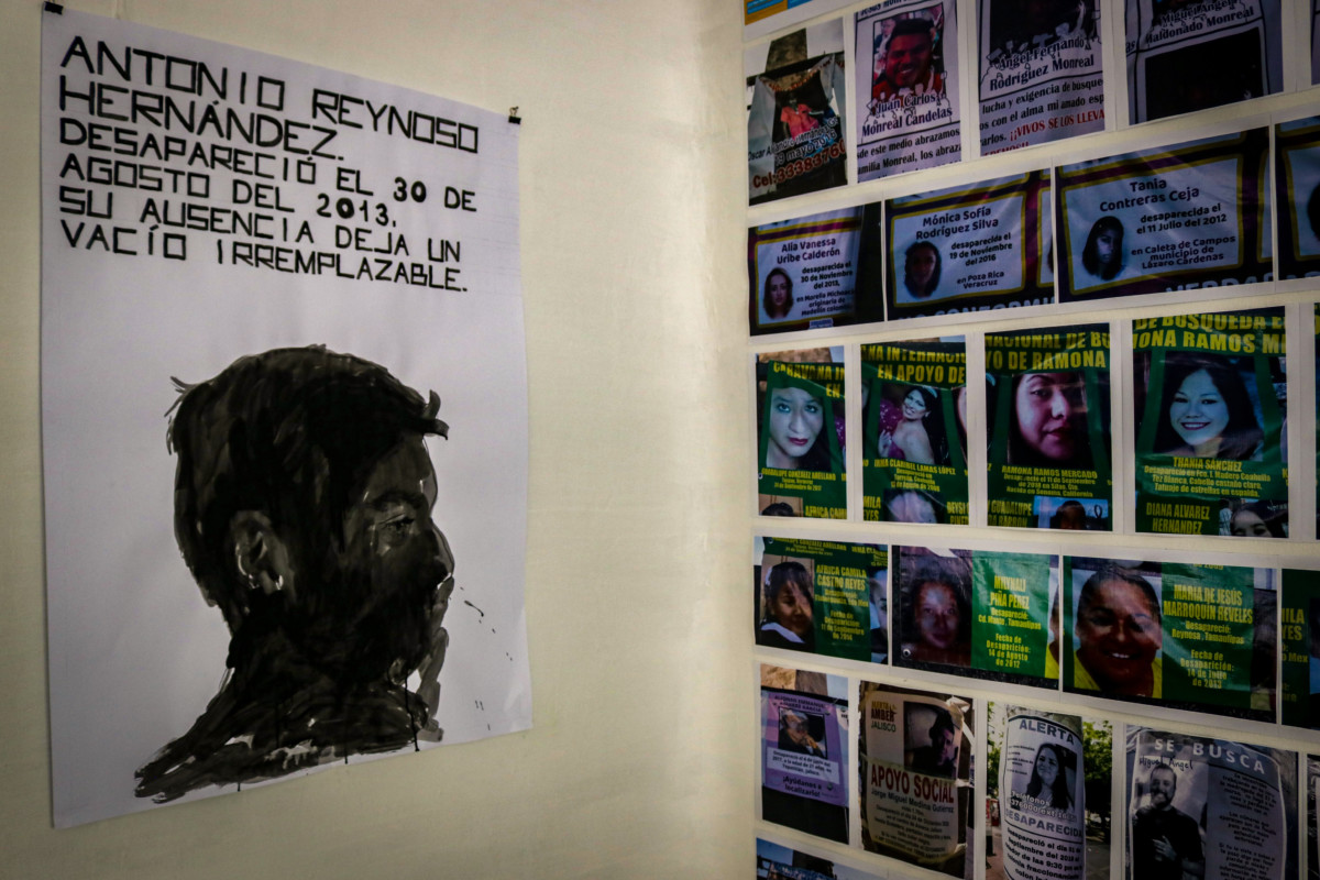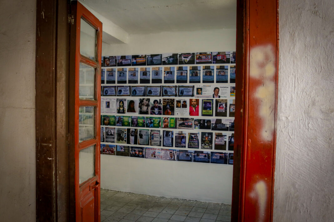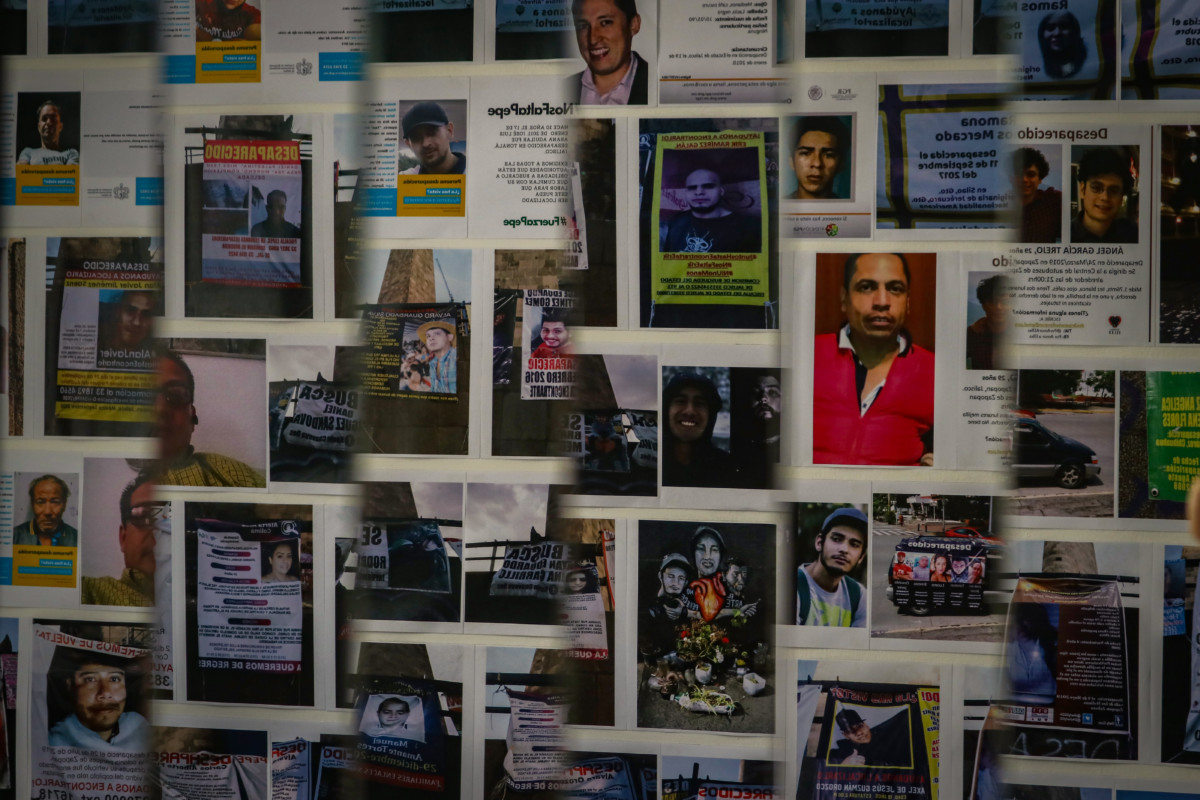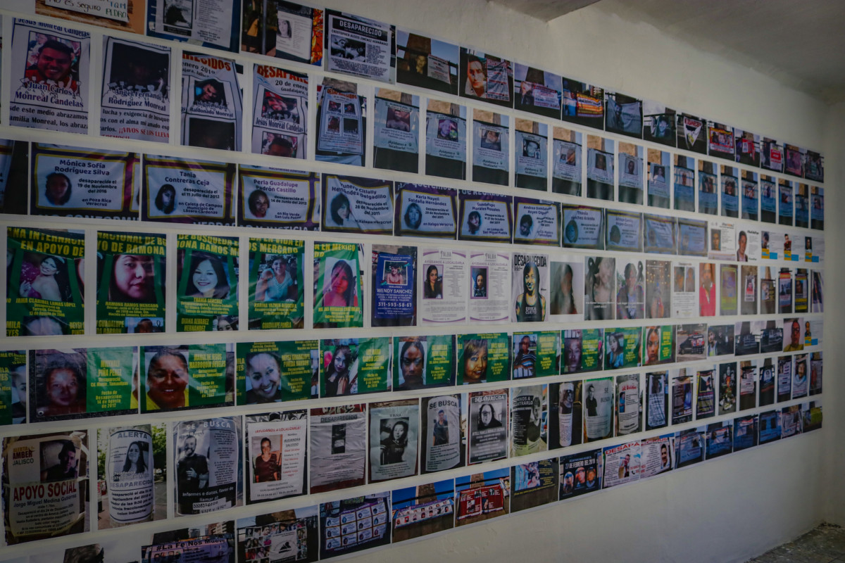 El primer elemento de la exposición se trató de un muro formado por fotografías. Estas muestran las fichas de búsqueda de personas desaparecidas que Julián ha encontrado por las calles de Guadalajara, así como en la Glorieta de las y los desaparecidos desde 2018, cuando desaparecieron Marco, Daniel y Salomón, los estudiantes de cine del CAAV.