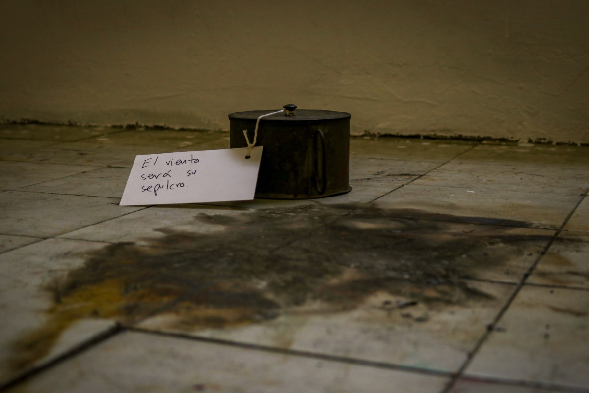 Como parte de un performance, Julián Helguera prendió fuego a algunos retratos que había dibujado, recogió las cenizas y las metió en una urna acompañada del mensaje “el viento será su sepulcro”. La frase hace referencia a un cuento de José Luis Borges y un texto de Javier Sicilia que el artista leyó alguna vez.