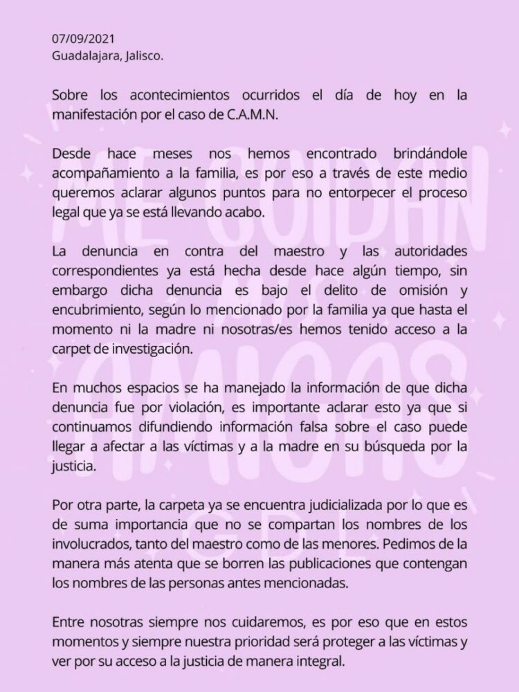 Para la colectiva Me Cuidan Mis Amigas, quien realiza labores de acompañamiento sororo a la familia de C.A.M.N., una de las niñas víctimas de violencia sexual dentro de una escuela primaria pública en Zapopan, Jalisco, es fundamental que no se pierda de vista el caso y que no se ponga en riesgo el proceso judicial que permanece vigente.