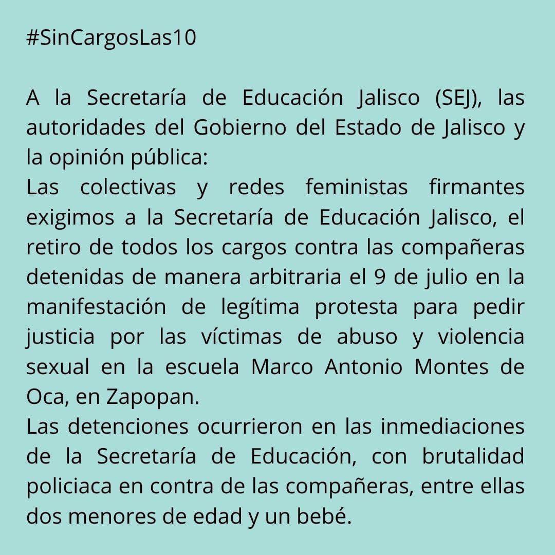#SinCargosLas10 es el hashtag que han utilizado diversas colectivas en el estado para exigir a la Secretaría de Educación Jalisco (SEJ) que retiren todos los cargos impuestos contra las 10 mujeres detenidas de manera arbitraria el viernes 9 de julio.