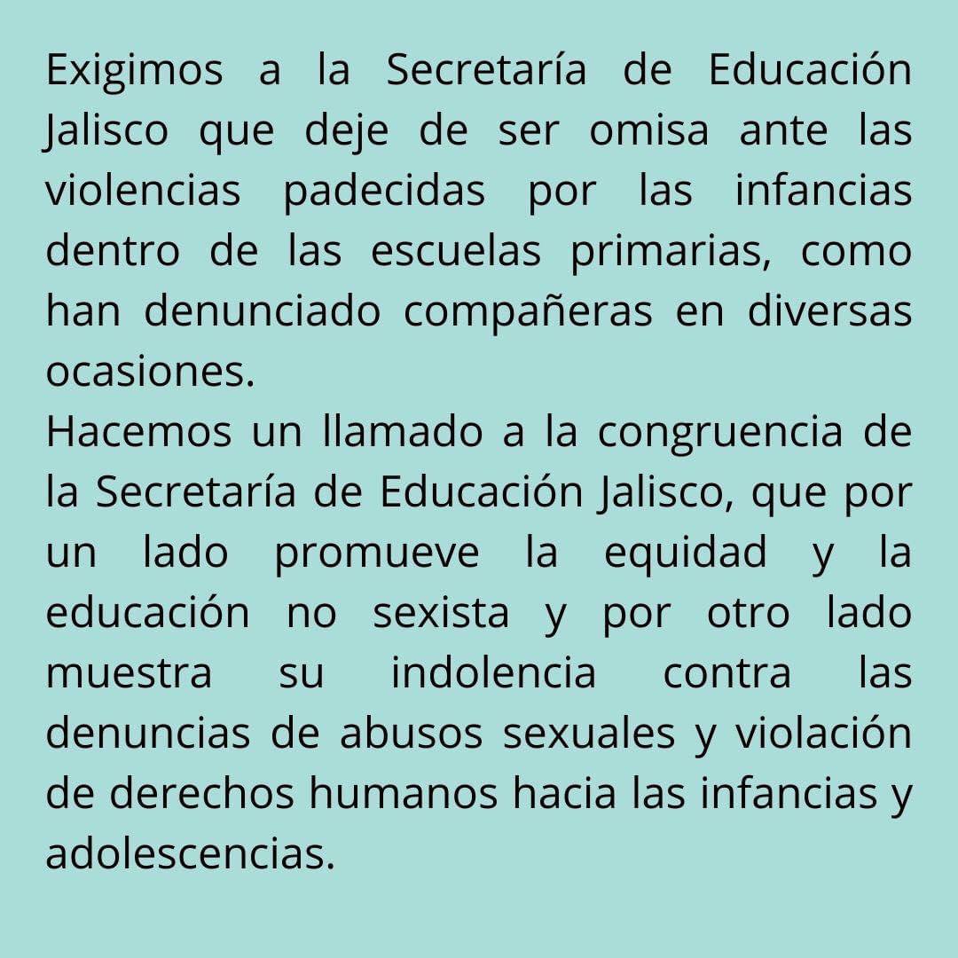 Al mismo tiempo, han requerido a la SEJ que deje de ser omisa ante las violencias padecidas por las infancias dentro de las escuelas primarias y llamaron a la congruencia, advirtiendo que, “por un lado promueve la equidad y la educación no sexista y por otro lado muestra su indolencia contra las denuncias de abusos sexuales y violación de derechos humanos hacia las infancias y adolescencias”.