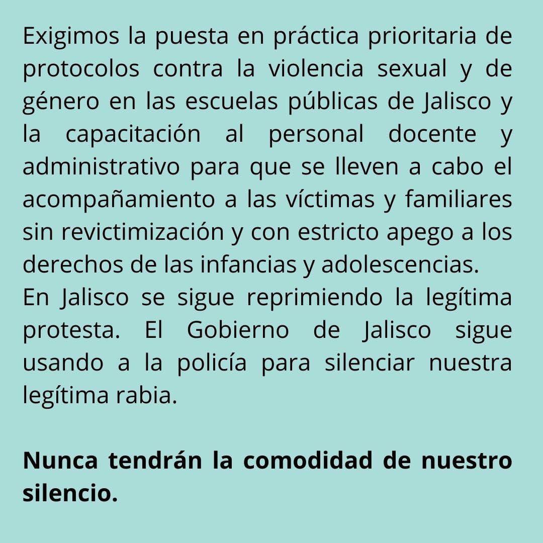 “En Jalisco se sigue reprimiendo la legítima protesta. El Gobierno de Jalisco sigue usando a la policía para silenciar nuestra legítima rabia”.