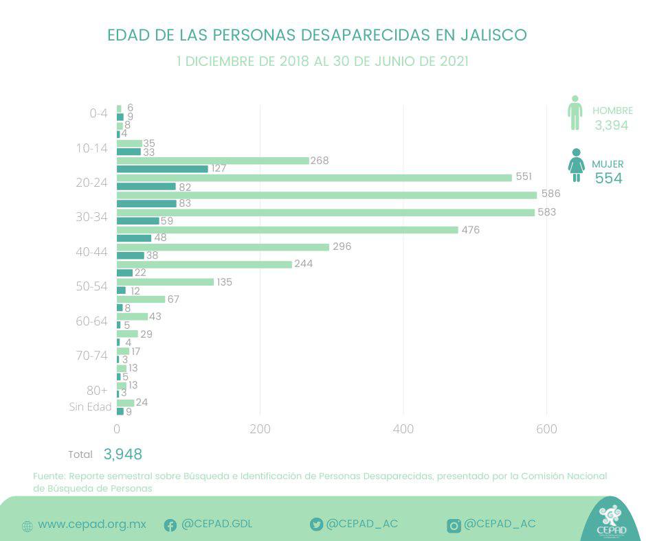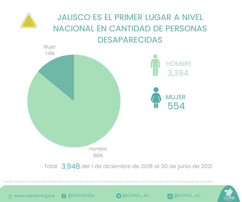 En los últimos tres años, -de diciembre de 2018 a junio de 2021-, Jalisco ha contabilizado la desaparición de 3 mil 948 personas; cifra que, sin considerar el subregistro de denuncias, manifestó el Centro de Justicia para la Paz y el Desarrollo (CEPAD), ha posicionado a la entidad en el primer lugar nacional con mayor número de desapariciones.