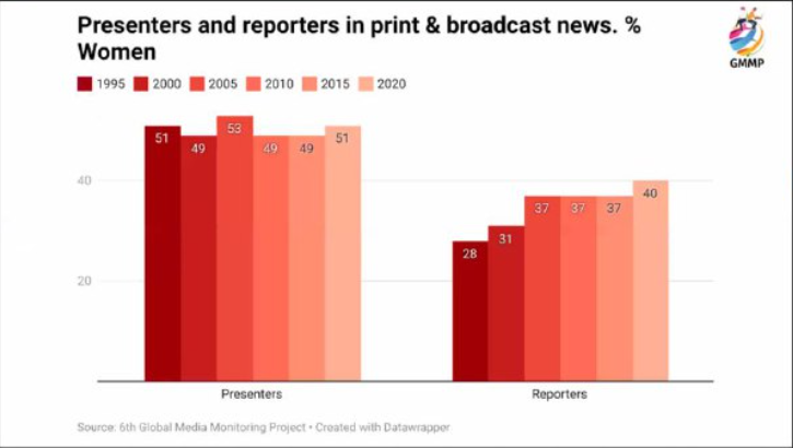 En cuanto a mujeres presentadoras de medios de comunicación la cifra se mantuvo con un 51% de 1995 a 2020, mientras que, las mujeres reporteras han aumentado de 28% a 40% en los últimos 15 años (sobre este último dato se registró sólo un pequeño aumento de 3 puntos de 2015 al 2020). Esto significa, expresan las y los integrantes del GMMP, que las mujeres no están tan al centro de la información como se quisiera.
