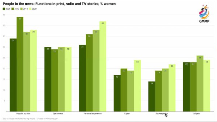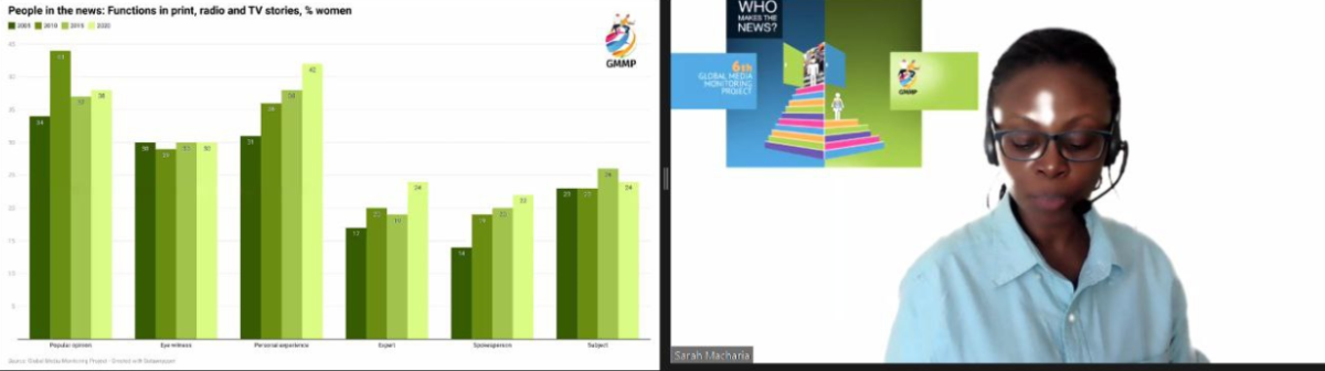 ‘’Manteniéndose con los patrones históricos, las mujeres ahora tienen más probabilidad de aparecer en papeles de especialistas y ofreciendo opiniones’’ informó Sarah Macharia.